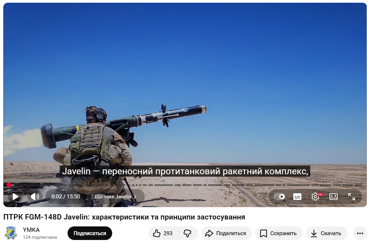 Відео присвячене огляду базової експортної версії Javelin FGM-148D. Всі подальші версії ПТРК, мають покращені характеристики (кратність зуму, дальність, ефективність ракети).